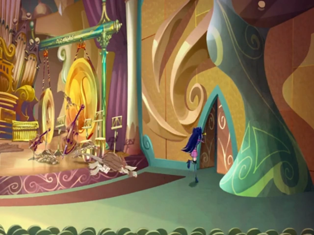 La cueva es de color dorado/cafe con algunos tubos más pequeños, lo que es su prisión. También hay cristales, que amplifican el chirrido de los Duendes Pandemonio. En el interior del Auditorio de Oro, hay una puerta que supone ser el camino a la Cueva como se ve en el episodio donde Musa, Tecna y las Pixies van se ocultan de los gritos de los Duendes.