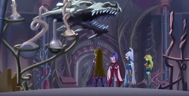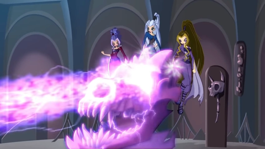 Su primera aparición es en El Himno siendo la pieza fundamental de las Trix quienes tienen como aliadas a las brujas de Torre Nubosa. Para un golpe en Alfea entre las tres hermanas forman un Hechizo de Intangibilidad en la cabeza del lagarto con el cual les otorgaron la capacidad de ser intangibles. Las brujas atacaron Alfea, pero pronto son vencidas con la potente magia crucial de musica; siendo Musa y las hadas menores.