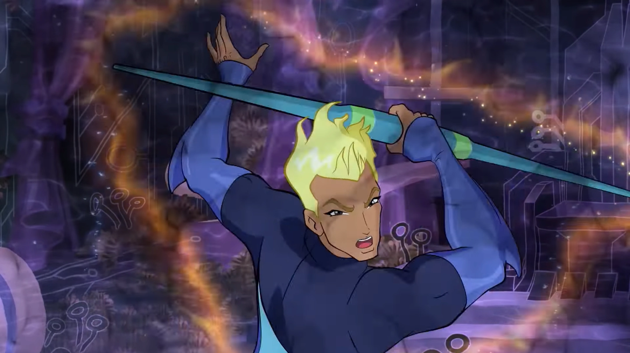 Él recibe una nueva arma que es una espada verde que le permiten absorber los rayos. Pero cuando el duelo, cae y pierde en su formación de batalla, pero fue salvado por Aisha.