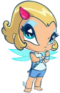 Nosi koszulę przypominającą kopertę, niebieskie rękawy, opaski i kostki do skrzydeł. Jest Boso. Ale w swojej wersji PopPixie nie dostała magentowej spinki do włosów ani niebieskich cieni do powiek.
