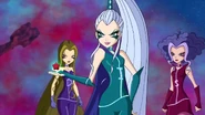 Stella, Flora şi Layla au dificultăţi cu noua lor înfăţişarea, ca urmare decid să zboare. Când intră în sala principală a bârlogului, se pregătesc să ia stelele, dar atunci îl văd pe Valtor care vorbeşte cu fiinţele din Dimensiunea Întunericului. Aceste fiinţe îi spun lui Valtor că vrăjitoarele Trix au ajuns, iar cele trei Winx care s-au deghizat în Trix nu ştiu ce să spună. Atunci adevăratele Trix vin să-i spună lui Valtor că totul este o capcană. Cele trei Winx îşi scot deghizările şi se întâlnesc cu celelalte Winx.