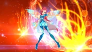 Bloom's Bloomix consists of her hair being a darker shade of red (similar to her Sirenix form) and styled with the top part of her hair pulled back, with a small section braided into a bun at the back of her head, and two small sections of her bangs loose while the rest of her knee-length hair hanging down. She wears a cyan tiara with an opal gem on her forehead. She wears a royal blue tunic with baby, dark blue and white dragon scale like pads accented by an amethyst gem at her chest, royal blue pants with baby blue scale patterns at the knees, cyan heels, and a translucent lavender organza cape extends from her back and connects to gold bracelets around her arms. Her yellow, red and blue wings are flame-patterned and flower petal-shaped with deep violet borders. Red spark-shaped jewels dangle off the wings.