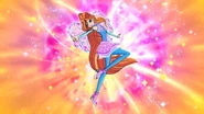 Bloom's Winx is a sparkly bright sky blue, cropped halter-turtleneck crop top decorated with an oval-shaped gold jewel at the center of her chest, a matching sparkly light blue miniskirt with matching-colored shorts underneath and light blue high-heeled ankle boots. She also wears light blue glove-like, detached sleeves around her forearms from the elbow to wrist with a point down the back of each palm and wears a small golden tiara with three rounded points at the top of her head. Her hairstyle remains the same as in civilian form. Her wings are translucent and have the colors of cyan heart-topped split inner layers with teal tips.