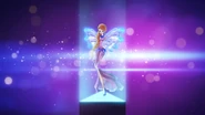 She wears a short strapless dress of pale blue color with ruffles at the top, and over the bodice she wears a second pink strapless ruffle top. She has a gold belt and over the skirt, she wears a long transparent pink fabric. She is wearing pink platform sandals and her hair is in a style similar to that of her Enchantix, only simpler and without decorations. Her wings are large and similar to those of a butterfly in blue color with drawings of round holes in purple color.