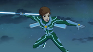 As of Season 8, his uniform is much more high-tech. He wears a skin tight green bodysuit with light-gray thin inner-lines that mark the suit. His entire jaw, chin and ears are encased in the same material as his bodysuit which is connect to the neck. There are thicker, slightly transparent metal plates on his forearms, hips, smaller pieces centered on the side of his thighs and wrap around the area above his ankle. He wears silver gloves and on back of his hands are yellow, round gems. From the center of his chest is a round, yellow gem which is held in place by four thick, slightly transparent metal plates. These metal plates then wrap around to his back which is connect to an oval, silver jet pack that houses Brandon's weapon of choice and transparent mechanical wings that allow flight, hyper-thrust, -frost and -charge. These hyper modes are activated by pressing the yellow gem, which flashes and beeps to signify the activation. The gem is also the source of all the suit's functions and must be repaired if damaged. His feet also has thick white soles. As showcased by Nex, this new suit has an underwater mode. The overall appearance of the suit remains unchanged. However, the transparent metals on his forearms change to fins, gloves become webbed, back of the calves have smaller fins, and the area between his feet and sole extend into flippers. The encasement of the jaw, chin and ears sport a breathing apparatus which covers the entire face. The thin inner-linings glow a bright color as do the fins, flippers and webbed gloves. All aid in visual acuity and smoother, faster movement in the water. |