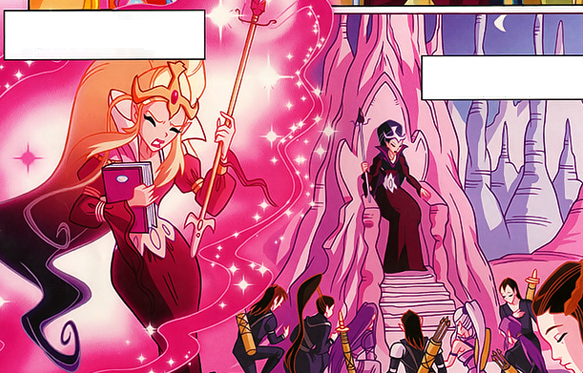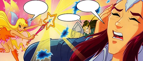 Whisper and most of the Dark Elves are temporarily blinded by Stella shining a beam of light over them, but this leaves Bloom open for Morwen to sneak up on her and snatch her half of the amulet away. She demands to know who gave Bloom that half of the amulet and, when Bloom reveals that it was given to her by an elf named Palladium, Morwen finds his name to be eerily familiar despite never knowing someone with such a name.