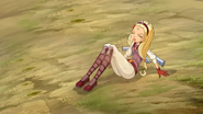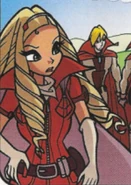 She wears her usual headband but it is dark red in color, she wears a white under shirt with round end sleeves, and a vest with a red belt with a yellow diamond on it with the top of the vest also red and has a short curvy collar. she has on red wrist high gloves, white round end pants, her hair is in a side ponytail (greatly resembling that of Flora's Sirenix form), tied by an elastic that matches her belt. She wears knee high boots, that are pale red and grey. Her vest also has another yellow diamond charm at the chest.