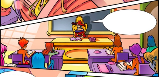 In Issue 33: Ghosts, DuFour carried out with exercises on the laboratory for the written technical magic potion test. Because of a suspect concerning the Winx, Principal Faragonda interjects on DuFour's class. DuFour answers that everything is alright and promptly allows Faragonda to do a roll call but Faragonda is interrupted by Knut as she was wanted on the phone. Later on, DuFour tells Faragonda that the Winx handed terrible exercises for the written test, resulting Faragonda on following them and discovering that their good will was also applying the most technical magic potion in the best way possible, and for such the Winx passed the test with full marks.