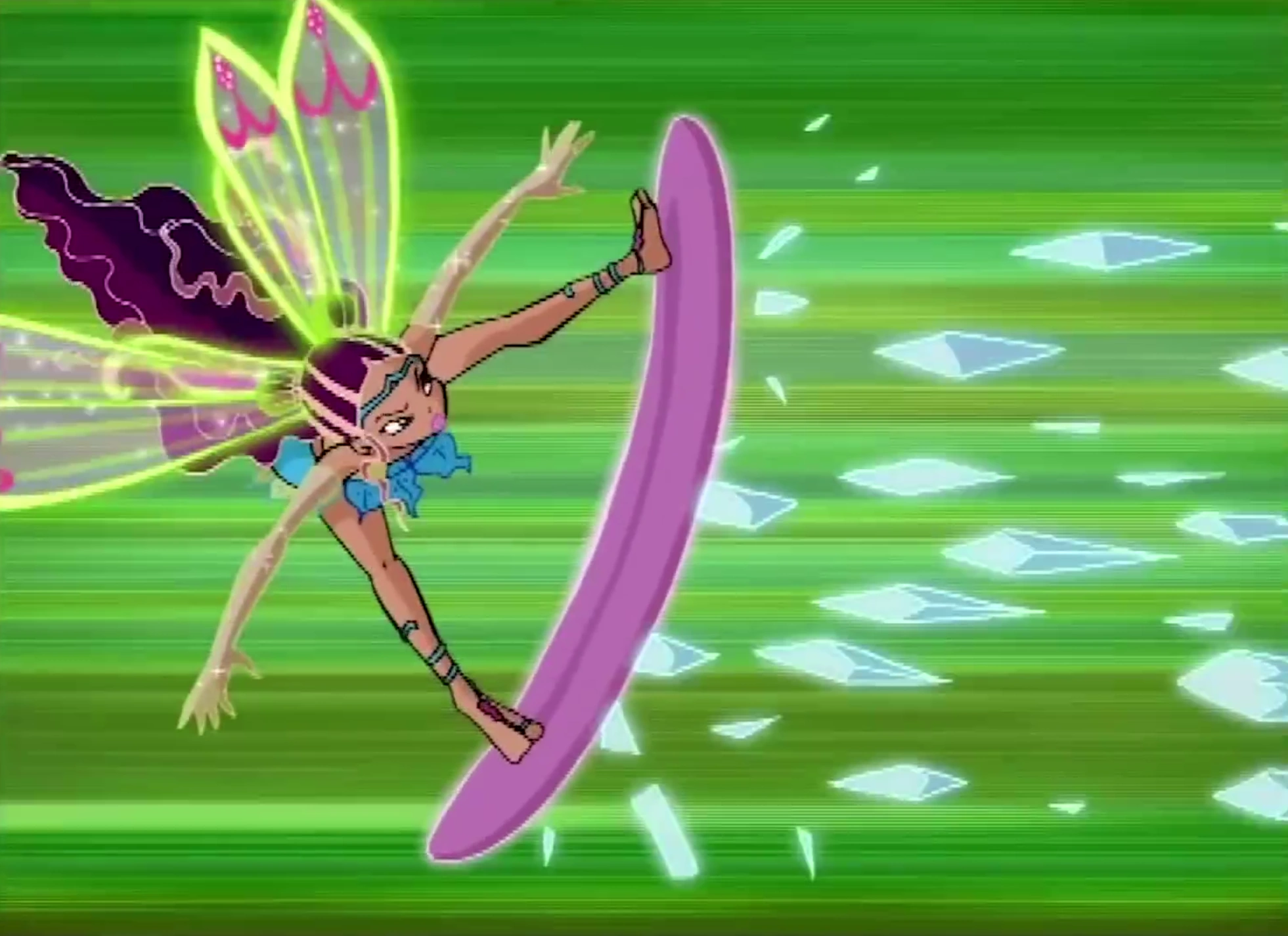 Enchanted Plasma is an Enchantix/Believix offensive spell used by Aisha where she either shoots a small pink ball or beam used to attack, forms a surfboard to defend herself, or launches a large amount of Morphix at the enemy to immobilize them.