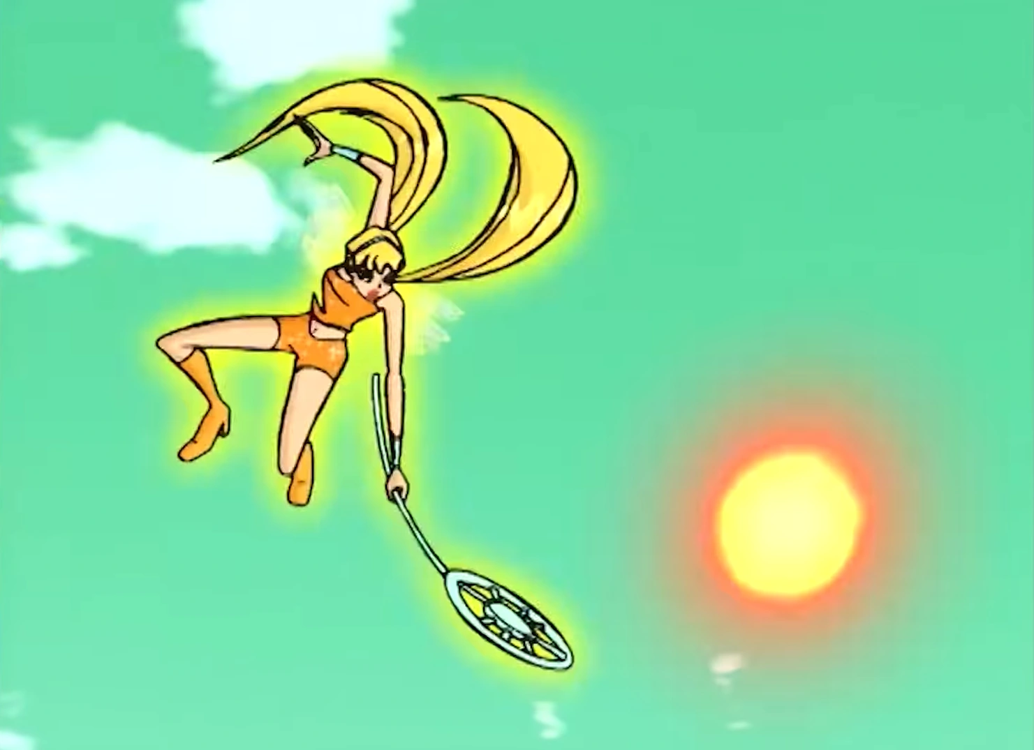 Full Power Sundown is a Winx offensive spell used by Stella. She uses her scepter to shoot a yellow light sphere towards the enemy.