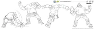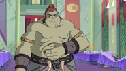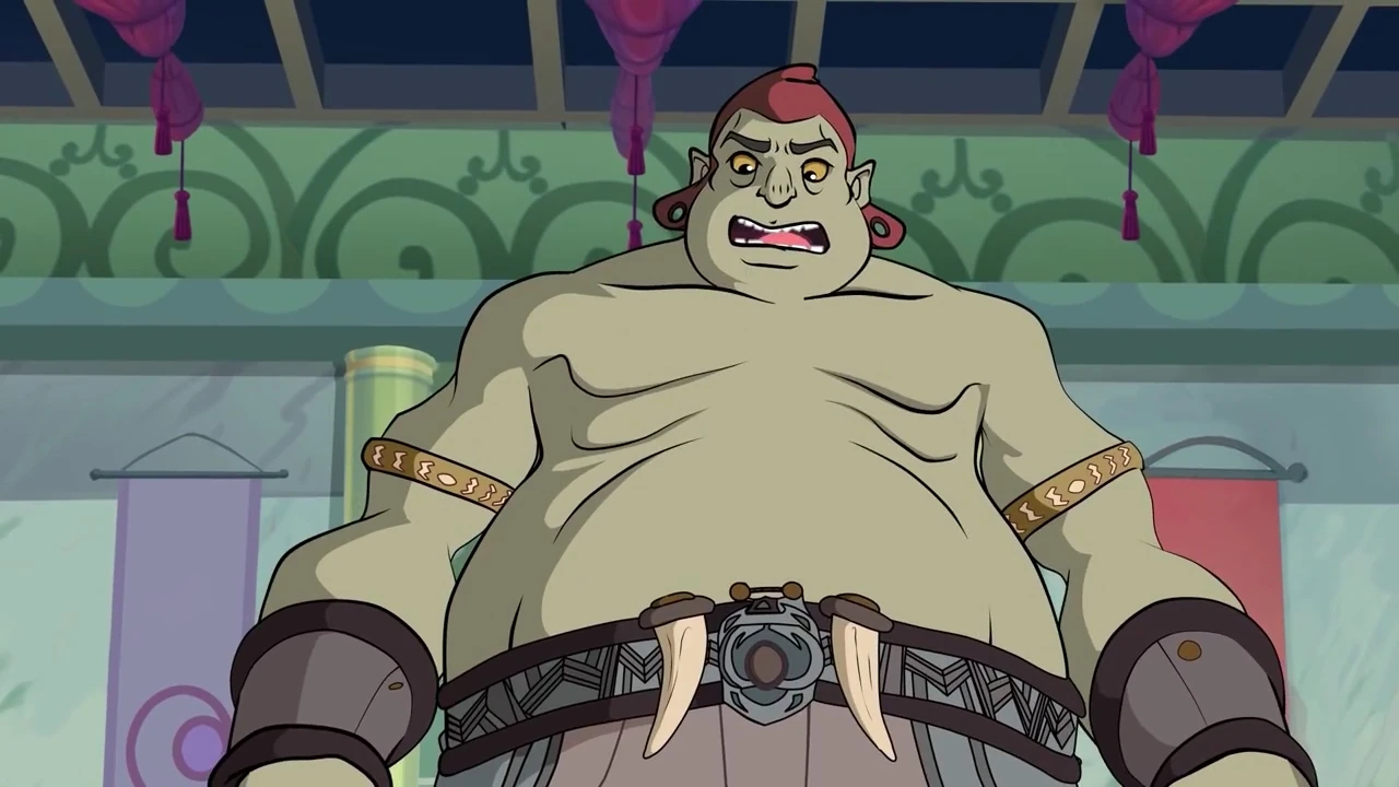 He is tall and obese with a light green body, orange hair, small pointy eras, and black shorts with dark khaki. And has gold bracelets on his upper arms.
