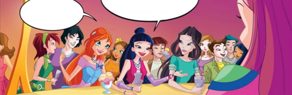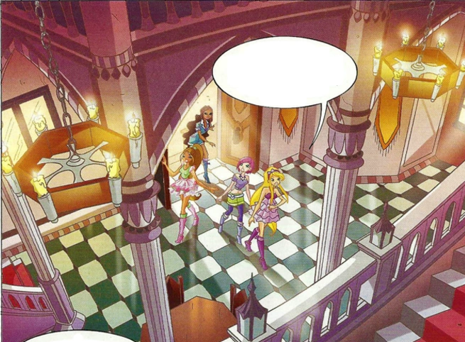 - On page 4, as the Winx take a look inside the hotel, Stella's dress is all lavendar, missing the parts of the dress that are supposed to be colored orange.