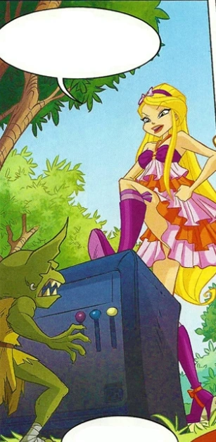 Meanwhile, in a forest, a goblin-like creature is struggling to push an amplifier around. Two more goblins are trudging nearby, carrying a pair of guitars and a drum set. The goblin with the drum set gets its foot caught under a small bit of tree roots sticking out from the ground and trips. The goblin pushing the amp advises that his ally not be so loud otherwise "they" might find them. Unfortunately for them, Stella confronts the goblins, ordering them to comply otherwise she and her friends will be forced to punish them. One of the goblins throws a cymbal from the drum set in retaliation and the Winx are about to transform to fight back... until they are interrupted by a voice from the trees.