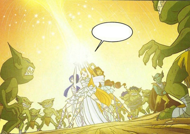 Sloan was once a noble elf of the Court of Light. He was able to become a prince, however, he made a terrible mistake once he fell under Maeve's charms. Maeve herself is a banshee of the Court of Darkness who had assumed the appearance of a beautiful young girl. Tecna cuts the story short to ask what a banshee is and Morgana responds by telling her that a banshee is a frightening and dark spirit. Banshees apparently have the ability to transform the sounds of their voice into energy and, thanks to such an ability, Maeve forcibly transformed Sloan and his followers into goblins who do her bidding. After a long battle, Morgana and the Earth Fairies were able to defeat Maeve and they cast her out in exile to another dimension. As for Sloan and his subjects, Morgana and the Earth Fairies could not reverse the curse Maeve put on them. At best, they were only able to remove Maeve's evil influence which gave them back their free will.