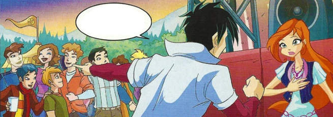 Soon enough, the Winx and Andy's band are getting themselves set up at the Celtic Music Festival. Bloom pulls Andy aside and asks him not go up on-stage. Andy cannot believe that Bloom is asking him this because his band had put in months of preparation for this performance and Maeve is excited to make her debut. Bloom tries to tell Andy that Maeve is only using him but Andy cannot believe a word of it. He then accuses Bloom of trying to prevent him from performing so that her band can keep the audience to themselves, believing that Bloom is afraid that his band could end up more successful than hers. Enraged, Andy calls Bloom pathetic and storms off. Flora finds Bloom and tries to cheer her up by telling her that she should not blame herself; that this is all Maeve's doing. Bloom quickly agrees with Flora and claims that there have even more of a reason to stop Maeve, even if it means interrupting Andy's performance. However, as Andy's band is playing, Maeve transforms into a green, goblin-like monster and begins turning the people in the audience into goblins. The Winx try to block out Maeve's singing but Bloom cannot bear to watch any more of this once Andy starts turning into a goblin as well.