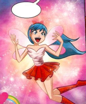 The blue-haired girl leaps into Bloom's arms as Faragonda introduces her as Romina. She claims that Romina is a young fairy full of talent and, as the four of them start walking, Romina sees a baby dragon sneeze on a little boy's lollipop, causing it to catch on fire. The boy starts to cry and Romina uses a spell that conjures up pink butterflies around the boy to cheer him up. As Romina takes pride in her spell, Faragonda urges Bloom to teach the young fairy a few things since she is her favorite fairy, but Bloom is too busy marveling at Romina being capable of casting a third-level comfort spell with such ease. She then invites Romina to come see a magical fashion show with them, to which Romina happily accepts. As they make their way to this fashion show, Romina tells Bloom that she has studied all of her spells. Bloom praises Romina on her diligence and tells her that a fairy must have control over her emotions in addition to casting spells.