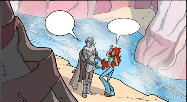 While looking for King Nobody, Tecna starts to wonder if Timmy would believe her if she told him about this adventure. She gets too caught up in her thoughts and almost falls down a cliff before grabbing onto an old root of a tree. Suddenly, Timmy appears and saves Tecna from falling. She asks how he got to King Nobody's prison realm and Timmy answers by claiming that he showed up because she was thinking about him. Timmy then starts to talk about how beautiful Tecna is and how his love for her is what makes him strong and decisive, compared to his usual shy and indecisive self. The two are about to kiss until Musa finds them together and wonders what they are doing; referring to "Timmy" as King Nobody. Tecna realizes that the "Timmy" she was with was King Nobody and gets upset. Musa scolds him for trying to trick Tecna but he claims that he simply came to help her. The rest of the Winx catch up and introduce themselves. King Nobody tells them that, with his kingdom being gone for centuries, he is the last of his people and the Winx assure him that they will break the curse. They explain how they will go about breaking the curse and Musa leads them to where she thinks crystal clear waters will lie; claiming that she saw a waterfall near some mountains nearby when she first arrived.