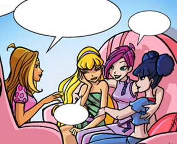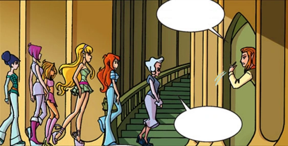 - On page 30, when the Winx realize that they are in the dream realm, they notice a man across the street from them. The man is standing just outside of a club, holding two women between his arms with money spilling from each of his hands, to which Stella comments that "they can really understand what he is dreaming about."