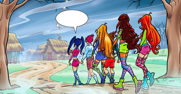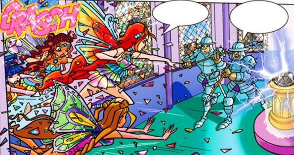 - On page 9, as most of the Winx, Brandon, Riven and Amore chase the Gloom Monsters in an attempt to free Stella from their clutches, Flora, Aisha and Musa's Enchantix forms hold some minor errors.