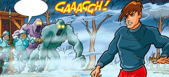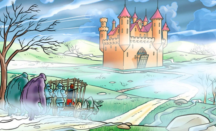 Meanwhile, the Gloom Monsters approach a cart full of barrels. They open one of the barrels, stuff Stella inside it and head off. Brandon's group, however, is not too far behind the Gloom Monsters. Lost in a dark and dreary realm, the group tries to figure out where they are. Brandon suspects that they are in another realm but it is hard to tell because there are no lights, stars or even a sun to give light to it, however, through the dense fog, Musa manages to catch a glimpse of what looks like a road. The group follows the road and comes across a small village. Brandon knocks on one of the cottage doors to see if the village truly is abandoned, and a woman opens the door, urging them to come inside before anyone sees them. The woman claims that if they are to get caught then they will get in big trouble.