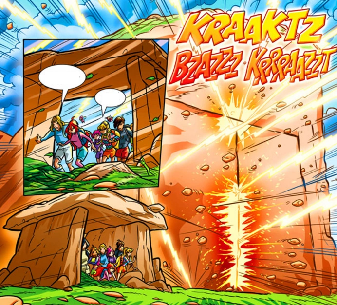 More and more lightning begins to strike at the group until they are able to find some rocks to hide under. As they take shelter, the lightning strikes at a nearby cliffside. Sky asks how such a large storm where only lightning occurs is possible, until Tecna comments on how the lightning is not striking at random, but is carving something into the cliffside next to them. The lightning carves out a gate to another world, which opens and releases Gloom Monsters. As the group tries to figure out where the Gloom Monsters are from and who could have released them, Stella proposes that they fight the monsters back or else Magix will be in danger again. Sky tries to get her back into the shelter but Stella runs out to confront the monsters. One of the Gloom Monsters tries to attack her but she manages to dodge and goes into her Enchantix to fight back. As she takes out the Solaria Scepter, the rest of the Winx come out of hiding to aid Stella in battle. The girls begin to fight the monsters as Brandon decides to join the fight as well, believing that they cannot sit back and let the girls fight alone just because they do not have their weapons with them. He swings a large stick at a Gloom Monster but nothing happens. Bloom attacks two of the monsters with a spell and they dissolve into fog, however, they quickly reform. As they try to figure out what to so, Bloom and Musa notice that the monsters seem attracted to Stella and they watch as she tries to fight them all back.
