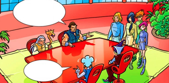 Meanwhile, at Red Fountain, Sky, Tecna, Helia and Timmy have gotten the three headmasters together and told them that the rest of their friends have become trapped within another realm. As they try to come up with a plan, Sky mentions that the door was destroyed and asks how they will be able to enter the realm. Saladin explains that they need to move fast if the other realm is planning to invade and suspects that the door they saw earlier was merely a wizard from the other realm testing his abilities. He, Griffin and Faragonda suspect that there must be a more powerful door somewhere close by that the wizard had prepared for the invasion. Codatorta tells the boys that they will organize multiple search teams and that the first team to find the door must destroy it. Sky, Timmy, Helia and Tecna then leave Saladin's office in order to prepare.