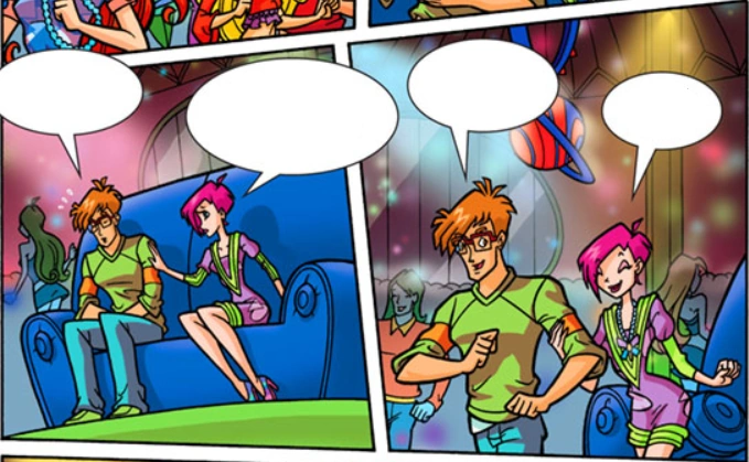 It is the postman, who delivers a package for Tecna. Musa thinks it is a gift from Timmy to forgive him, but when Tecna opens the package, it turns out to be a butterfly-shaped pendant, sent by none other than... Joel! Tecna is surprised because he is the reporter who interviewed her. Bloom says that she should not wear it but Tecna refutes her and decides to wear it to make Timmy jealous. Hours later, at night, the Winx and the Specialists are at a party. Bloom is sad that Tecna and Timmy are not on speaking terms, but Stella says that it's always fun to make up after an argument or fight. Tecna and Timmy are sitting in an armchair, apart. He thinks she should not wear that pendant, but Tecna replies that she wanted him to see that she is upset. Timmy apologizes and in the end they manage to reconcile, going out dancing together. During the night, unknown individuals infiltrate in the garage where the missile is.