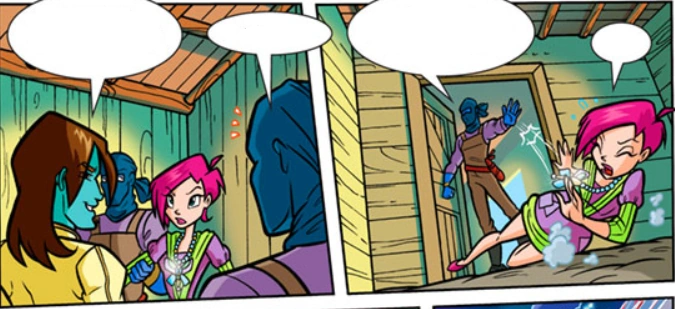 Sky sends Tecna to a waiting room with the rest of the girls and tells her to wait for his call. Bloom asks her how she feels and Stella thinks they should go too, but Bloom thinks that would make the thieves angry. Tecna says that she can use her magic if things get bad, but Stella still believes it is a very dangerous situation. Sky appears and calls Tecna, an assistant gives the girl a bag with the money and a map with instructions to get to the indicated place. The girls wish her luck and warn her to be careful. Suddenly, Timmy appears, holding Tecna by one arm.