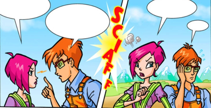 The next day, the Winx go to the garage where they are assembling the missile, where the Specialists are already helping. Timmy wants to show Tecna some codes that he programmed into the simulation, although a reporter bursts in, wanting to ask Tecna some questions. She agrees and ends up making a brief tour of the entire facility, explaining how the missile works and, in the process, explaining that everything is under control. At the end of the interview, Tecna says goodbye to the young reporter and they agree to meet another time. Timmy is waiting for her, upset that she ignored him, claiming that he has never seen such a presumptuous reporter. He adds that he is jealous and Tecna, angrily, slaps him on the cheek. That same afternoon, Tecna is with the rest of the Winx at her hotel, she feels bad because she hit Timmy. Stella indicates that she did the right thing, but Tecna is not so sure. Bloom tries to calm them both down, but suddenly, the doorbell rings.