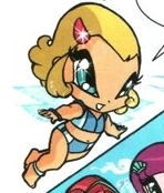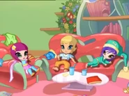 They wear a shirt resembling an envelope, blue sleeves, wristbands, wing anklets and barefooted. But in their PopPixie version, they have no magenta hair clip and no blue eye shadow.