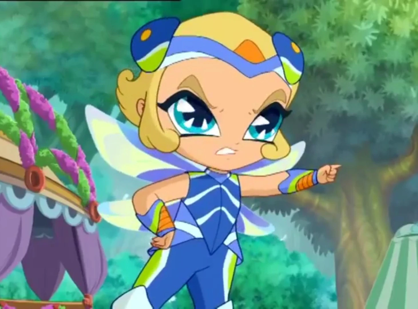 When transformed, Livy's wings resembles a dragonfly's. They wear a blue tee-shirt with lighter blue and multiple colors striped in; blue pants with green on the outside, and blue, white, and orange boots/shoes with matching armbands. Livy also has on a blue-lilac V shaped piece on their head with a small orange center and a dark blue half-circle on both sides of their head with lime green and orange on them, almost resembling eyes.