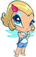 Livy is a slightly tanned-skinned Pixie with bright sea blue eyes and dark blue eyelashes. Above their right eye is a sky blue mark; while on their left is a darker blue mark. Their hair is sandy blonde with a curly flip, reaching their neck, while their bangs are very short and pulled back. They are barefoot and wear ankle bracelets with wings, similar to Roman god Mercury.[1]