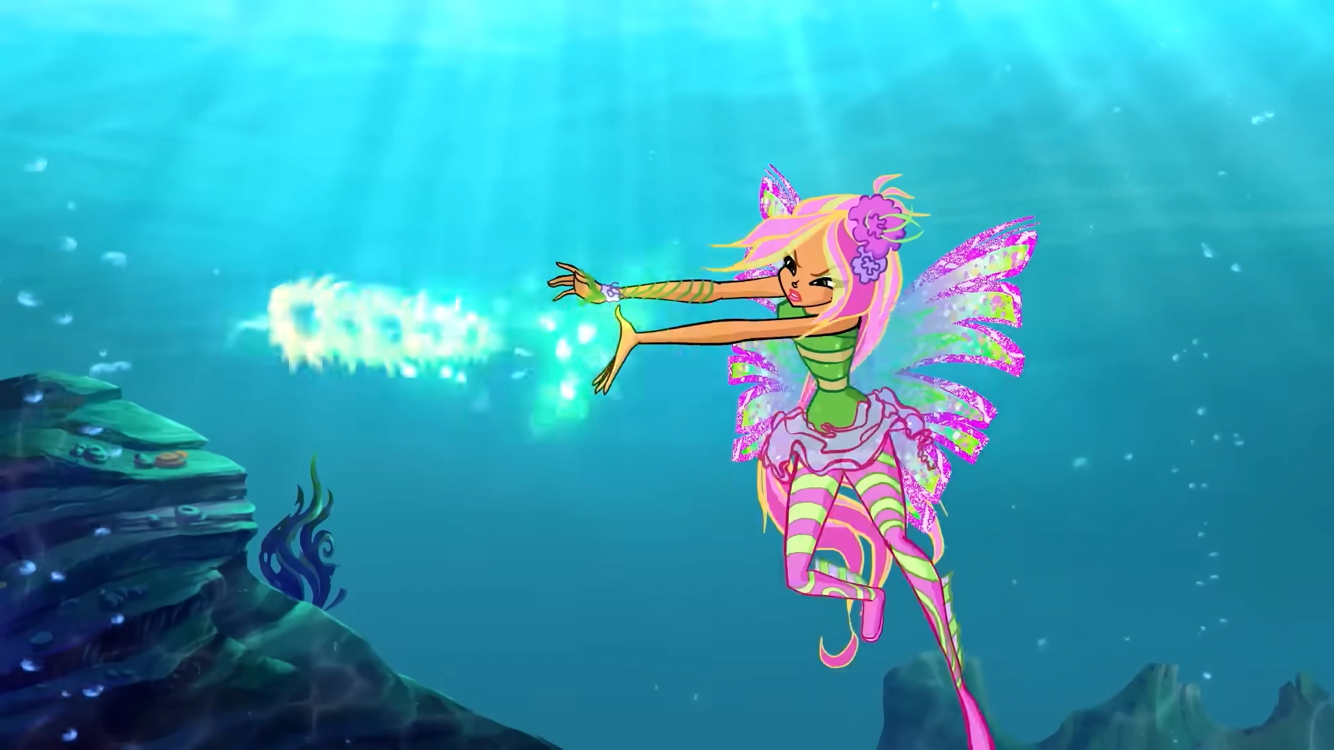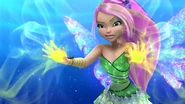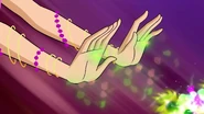 Lotus Flower is a Sirenix offensive spell used by Flora. She releases a green ball which becomes multi-colored after hitting the enemy; or she shoots a light green flower-shaped beam towards the enemy; or she shoots a glowing, multi-colored beam of flower petals towards the enemy.