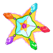It's a yellow star shaped box with the blue gem located in highest point of a star along with a red gem being at its left side and orange gem being at its right side and the green gem below the red gem and the purple gem below the orange gem.