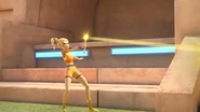 - Season 1 episode 10 - Used twice, first against a droid in an obstacle course. Then, against a disco ball to make it fall.