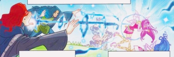 In "Mythix", the Winx go to Tir Na Nog and meet up with Nebula, who had converted Morgana's castle into a school for Earth Fairies. Nebula shows the Winx the Mythix Wands on display in a vault. According to her, seven fairies from the Legendarium crossed over to the real world and traveled the many worlds of the universe, including Earth. She also mentions that the wands are impossible to hold until a fairy has proven herself worthy before them. Aisha believes they've proven themselves many times from all their battles against the Legendarium monsters. Suddenly, the castle is under attack by the Trix and some witch recruits. The Winx come out and transform. Eldora also transforms to join in on the fight. During the fight, two witch recruits sneak past and enter the castle.Bloom quickly follows them to stop them from getting to the wands and easily dispatches them.