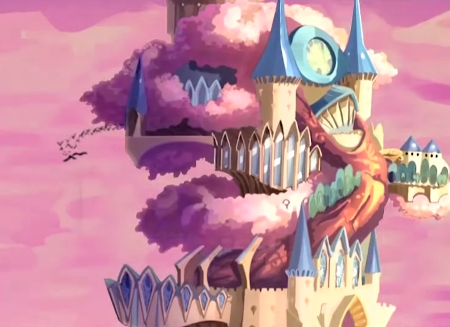 The royal palace is where the Fairy Queen lives. In the underground corridors, there are the statues of all the previous Fairy Queens who once ruled the Earth Fairies. The palace itself looks halfway between a building and a tree, as it has gigantic roots at its base, and branches with lots of pink leaves.
