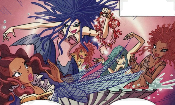 Realizing what the moving stars of the Mermaid's Tail constellation meant, Teredor explains that the Dark Sirens emerge from the deepest depths of Andros' oceans every time the constellation shines brightest in the sky. Using any body of water to reach the mainland, the four Sirens, Nazca, Terala, Unla and Limes, sneak into Niobe's bedroom through the water spouting out of her fountain and attack her. As they drag Niobe back into the depths of the ocean with them, their leader Limes leaves behind a coral necklace at the scene of the attack. With Niobe as their target, the Winx quickly realize that the Sirens plan to convert her into the fifth and final Siren needed to complete their group, and Teredor reveals that they will become invincible if that were to happen. So, the Winx promptly go into their Harmonix and enter Andros' oceans to rescue Niobe.