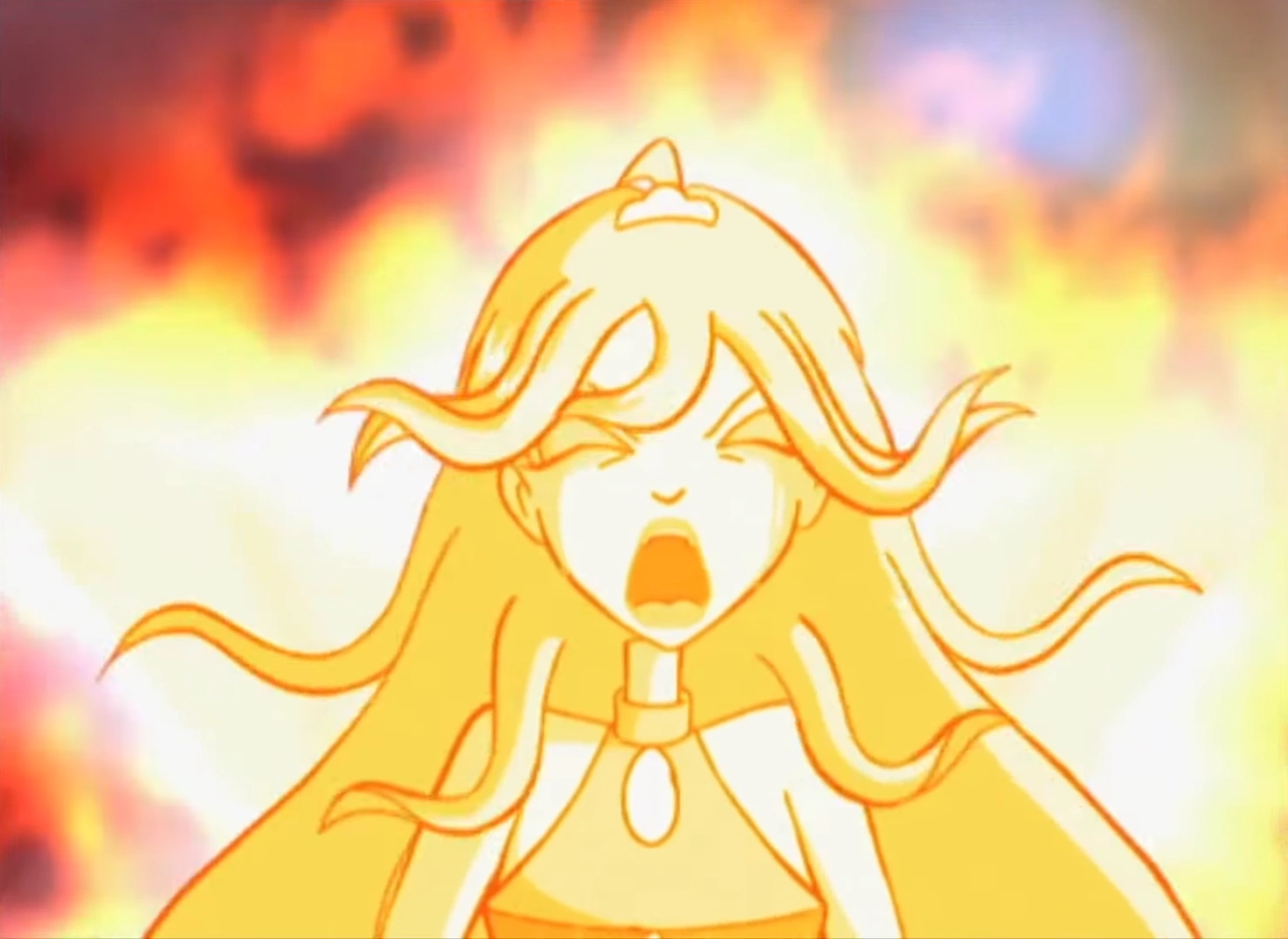 The Trix uses magical dolls to appear in the simulator and are measuring her powers, but because she is mentally suppressing them, they decide to make her completely emotionally distressed to reveal the strength of her power. They succeed by having Icy blast Kiko off a cliff and into a fiery pit; Bloom dives in to save him but fails. Completely distressed and enraged, Bloom releases an enormous amount of powerful magical energy, confirming the Trix's speculation that she has their ultimate prize: the Dragon's Flame.