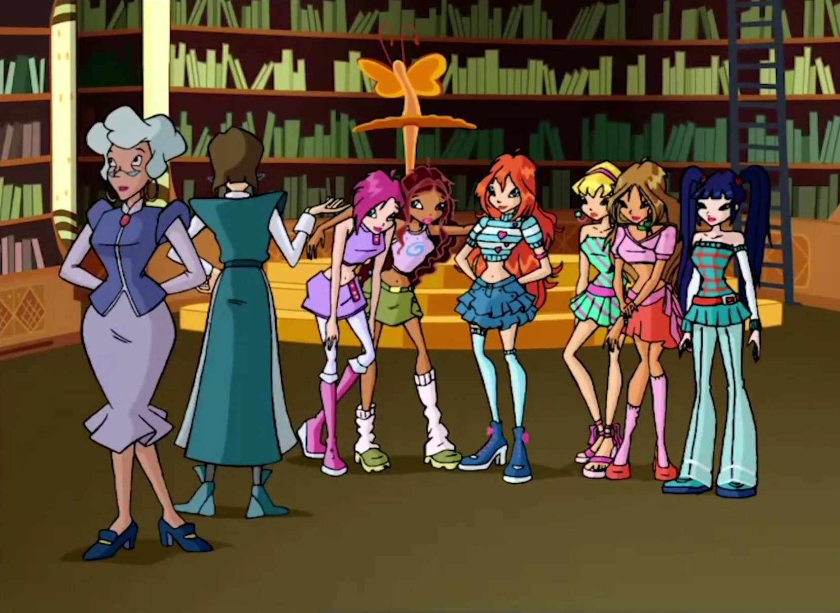 - When Griselda was explaining the punishment to the Winx in the library, Aisha and Flora were standing next to Stella in a line with all of the Winx, but then switch to being in their own line on a different side in the next shot. The pixies are also missing in this shot.
