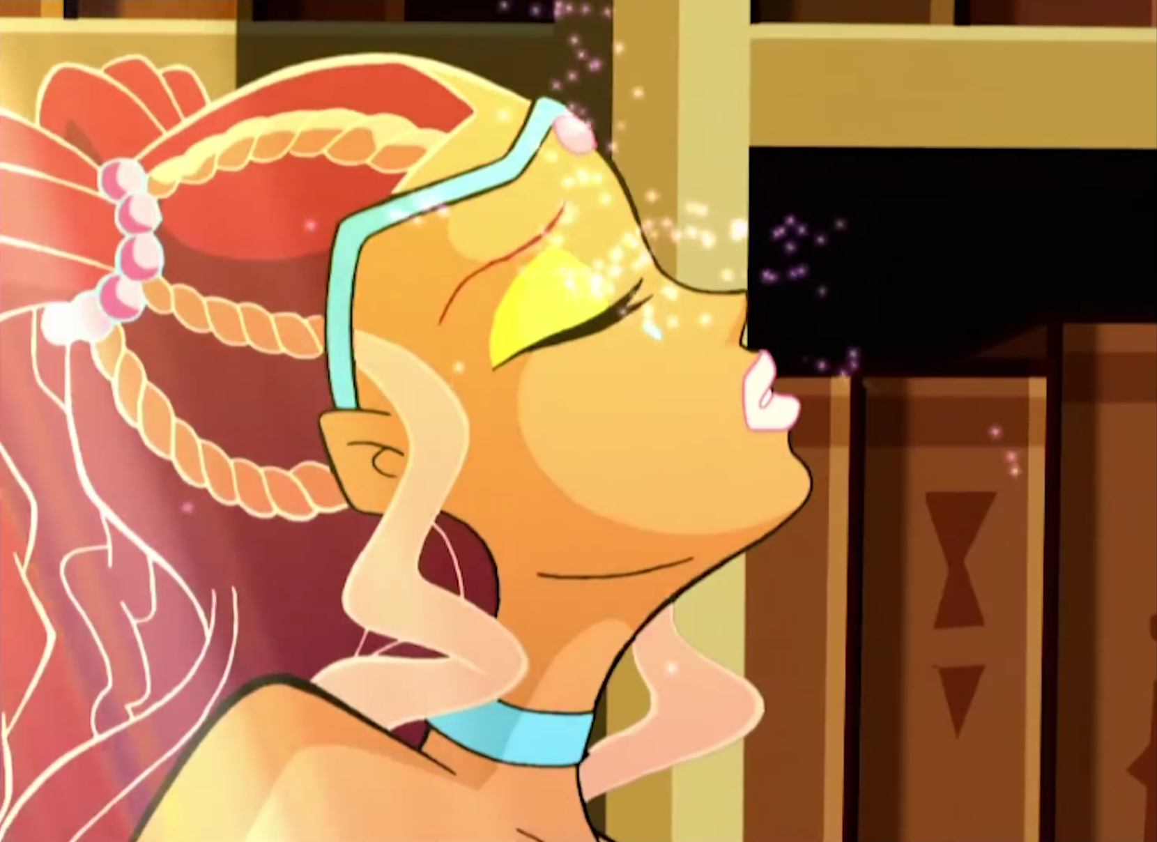 Aisha uses her Fairy Dust on her eyes.