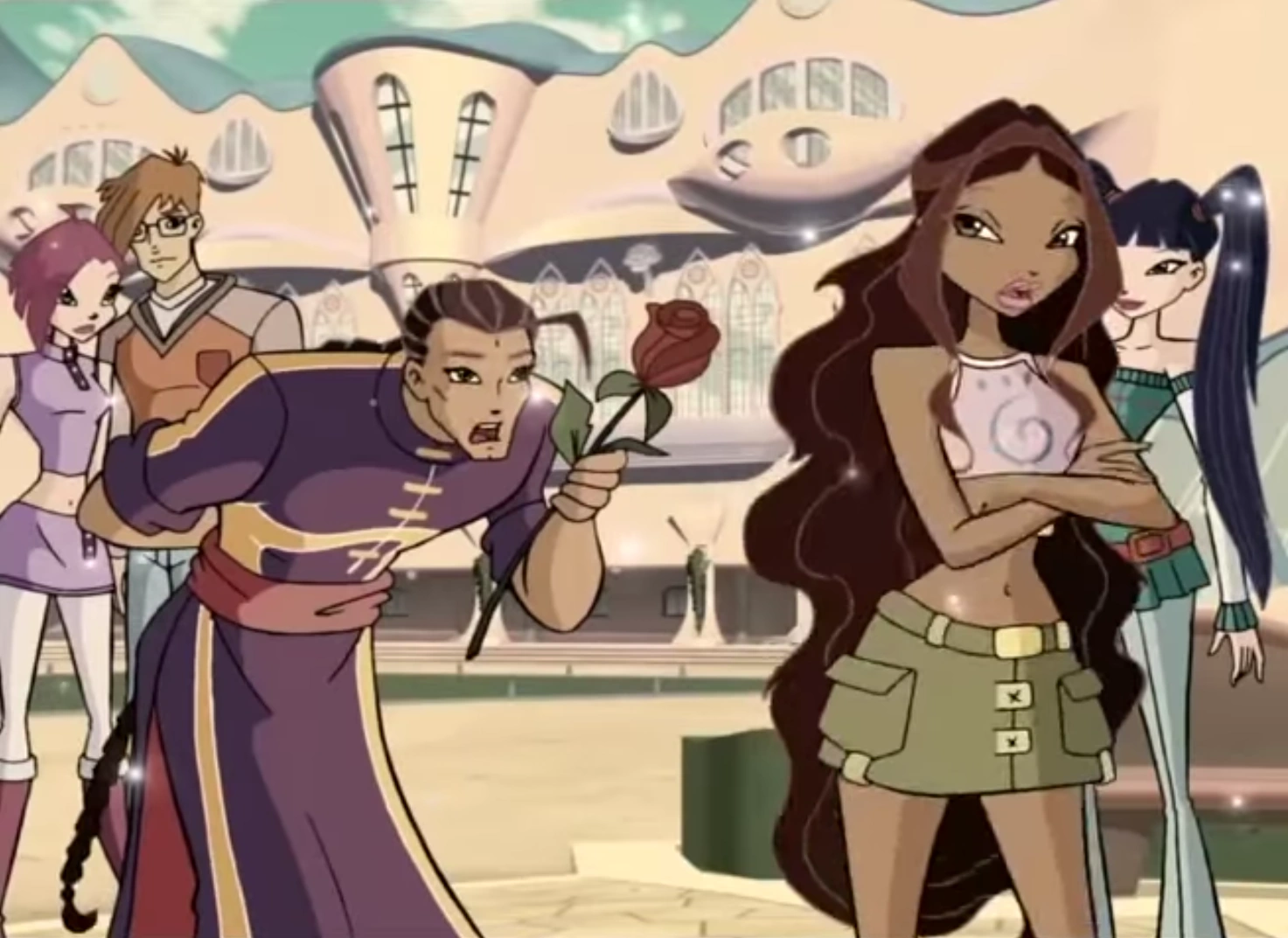 - Aisha's bangs are not colored in in one scene.