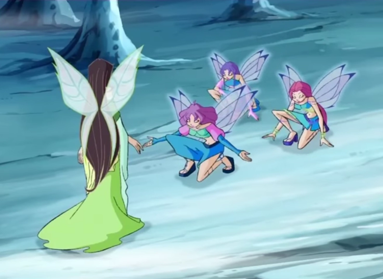 The Wizards then attack while they are distract, they cause the area to cave in. Aisha and Nebula chases after them. The Winx have the Specialists escort the Earth Fairies safely out while they themselves follow Aisha to bring her back.