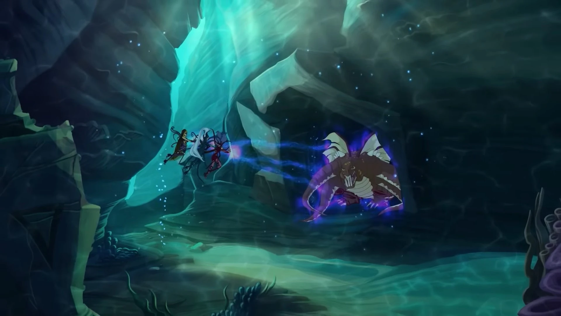 The Trix are swimming about in the seas of Domino, planning their next move to take down the Winx, especially Daphne. Icy leads Darcy and Stormy towards a cave which is inhabitated by an underwater monster, for them to use to destroy Daphne's party.
