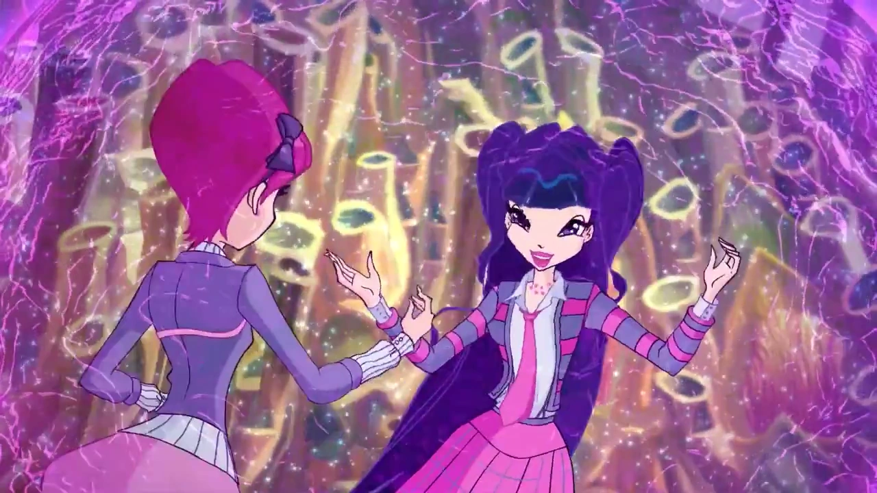 By combining their powers, Tecna and Musa manage to eliminate the Sprites. At the end, Diletta congratulates and thanks the Winx and says that their composition will forever echo in their hall. Daphne is amazed and compliments them. Musa and Tecna argue softly with happiness, so the Winx and the Golden Auditorium students laugh and cheer.