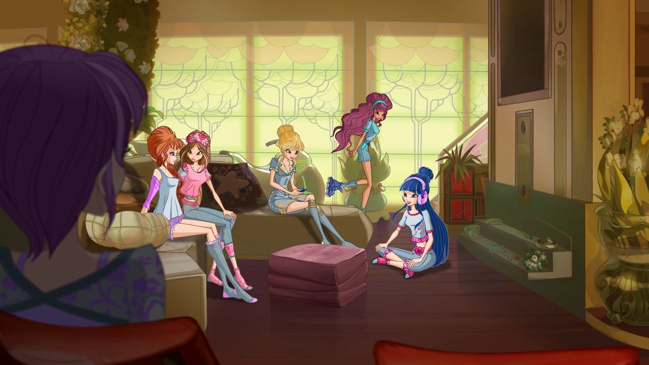 At the Winx Loft, Bloom declares that their objective is no longer solely about saving talents kidnapped by the Talent Thief, but it now includes saving Annabelle as well. Bloom claims that they need an idea first and Aisha suggests that they figure out a way to get back to the dimension where all of the kidnapped talents are being held. Musa asks Aisha about how they will even go about doing so as they tried to access the world before with their powers but with no results. Flora suggests that they could try contacting Annabelle but Stella parrots her idea in a louder voice. Aisha points out that Annabelle disappeared before them, leaving no traces behind, and Musa suggests that the golden dust they collected from earlier missions may help them. Flora brings up the fact that it worked on Annabelle once before and believes that it may work on them as well, but Stella parrots her idea in a louder voice once again. However, Tecna is not sure if the dust will work on them and they do not have that much of it left. Aisha, now frustrated, insists that they have to try something and volunteers to do so herself. Tecna urges for Aisha to slow down as she does some tests on her tablet. She comes to the conclusion that they only have enough dust for one try but Aisha claims that their problem cannot be solved by Tecna "playing on her tablet." Tecna claims that she was only trying to help until Flora reminds the girls that Ace's show will be starting soon and advises them all to play along to avoid blowing their cover. Musa turns their TV on as she asks about Annabelle. Bloom is certain that they will find Annabelle and rhetorically asks the girls whether they are or are not the Winx Club. Aisha skates up to Bloom's side and declares that, in the meantime, they can look for and protect other kids that may end up becoming targets for the Talent Thief.