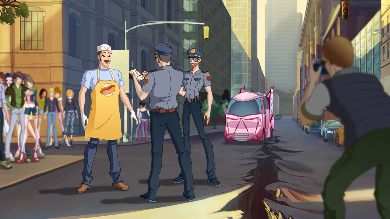 The girls return to the site where the crocodile creature first tried to attack publicly and see that a large crowd of bystanders, witnesses, police and news reporters have gathered. Tecna notices that their signals has disappeared but she is confident that Naoki should be around. The girls soon begin their investigation into the creature, starting with an excitable man trying to mimic the creature's movements. Flora investigates the cracks in the asphalt as Tecna and Aisha interview a middle-aged woman. Bloom and Flora investigate the cracks some more as Stella is preoccupied with posing for some of the bystanders, only to be dragged away not long after.