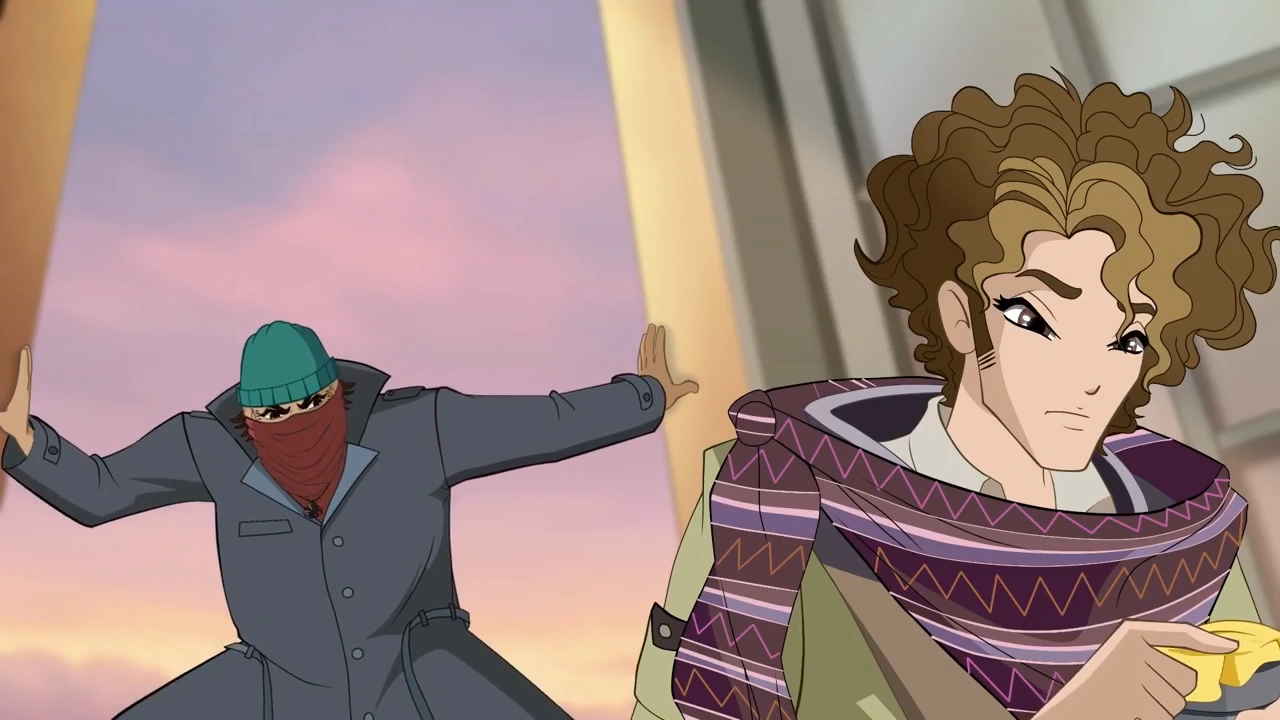 Hearing this, Tecna runs back to check on her friends and catches sight of Aisha and Stella dangling from the ledge of a nearby rooftop. Naturally, she pulls them up to safety, but this just means that they have now lost sight of Matt's kidnapper and have lost Matt again. However, their target may be closer than they realize, as it turns out that Matt and his kidnapper are hidden behind a nearby building out of the Winx's field of vision.