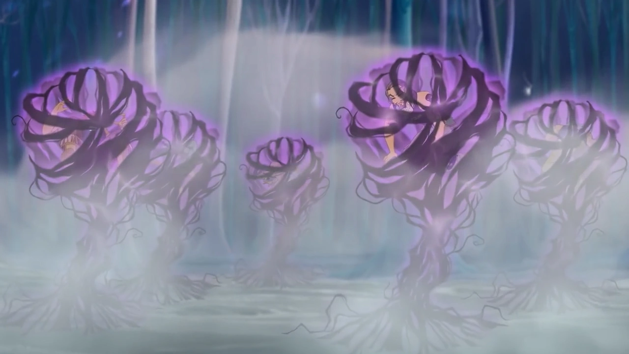 Back in the World of Dreams, Bloom, Musa and Flora find the Pirates encased in spheres bound together by shadows. Bloom tries to break one of the Pirates free with a direct blast of fire but the trap turns out to be stronger than she initially thought. Musa tries to use a direct onslaught of powerful sound waves and, when that does not work, Flora tries to transform the shadows into something else using a magical flurry of flower petals. None of their methods are effective in putting a dent in the traps, so Flora suspects that there may be another way to unlock them without hurting the Pirates inside.