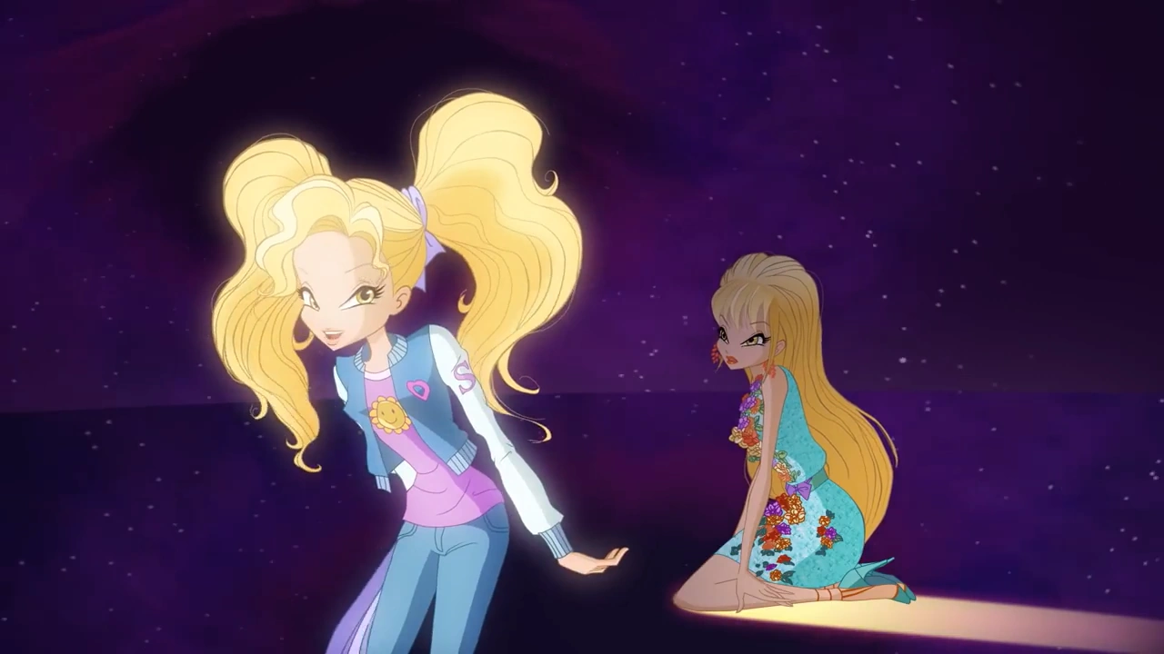 As she sobs alone in the void, Stella's younger self reaches out to her and tells her not to cry. She then asks if Stella remembers when they pushed past all of this, but Stella insists that she is alone now. Her younger self claims that they will never be alone with their friends by their side, but Stella is convinced that she chased them all away. Her younger self insists that their friends would never leave them as that is what real friends are for and, deep down, Stella is aware of this. Wiping her tears away, Stella hears the voices of Aisha and Tecna praising her from earlier about her people skills, giving her the strength to dispose of Obscura's void.